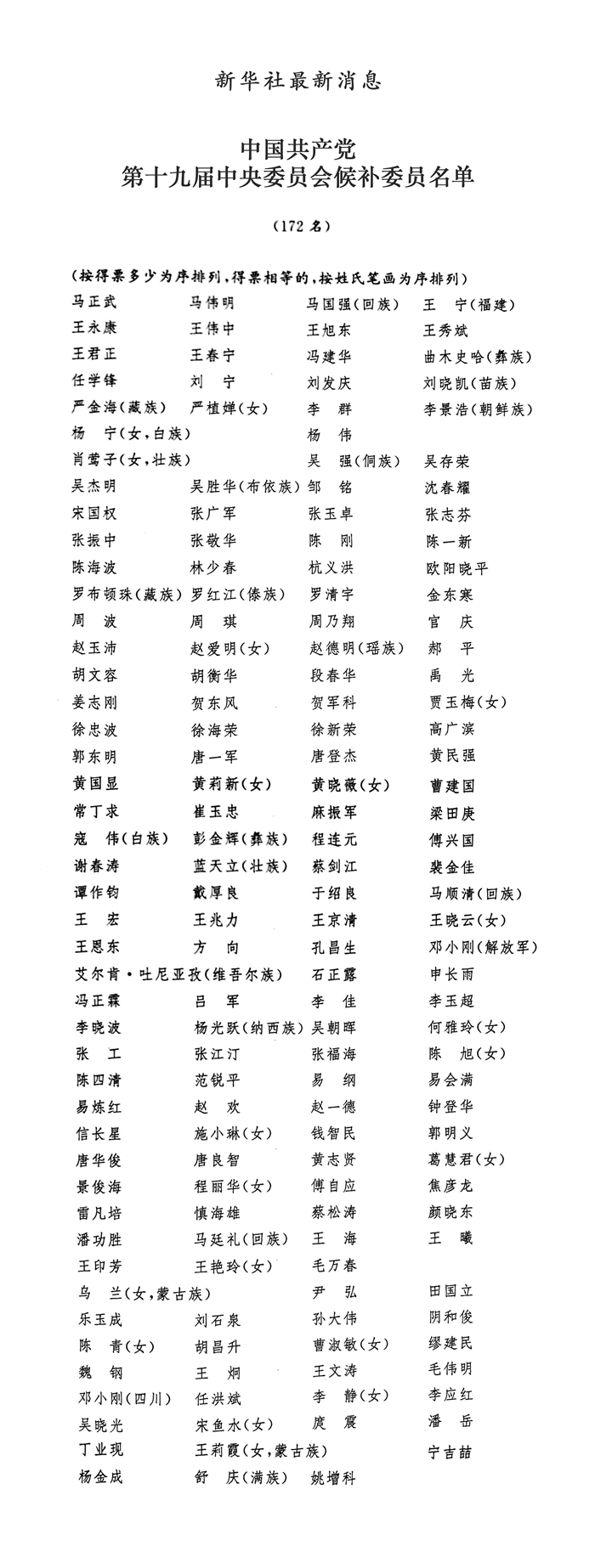 關(guān)鍵詞:中國(guó)共產(chǎn)黨;候補(bǔ)委員;中央委員會(huì);名單
