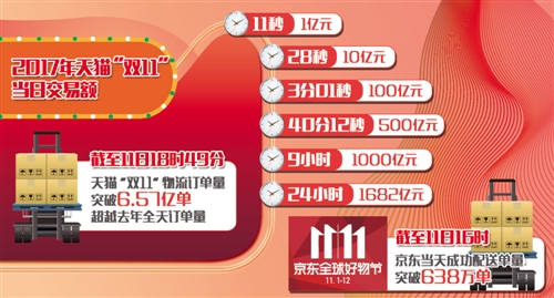 蘇寧易購也宣布,11日8時52分,全渠道銷售打破去年“雙11”全天紀(jì)錄,截至12時,蘇寧全渠道增長182%,其中,線上增長227%。