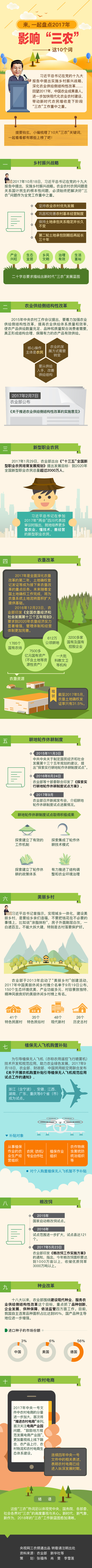 央視網(wǎng)消息:習近平總書記在黨的十九大報告中提出實施鄉(xiāng)村振興戰(zhàn)略,深化農(nóng)業(yè)供給側(cè)結(jié)構(gòu)性改革……回望2017年,中國農(nóng)業(yè)成果喜人,進一步加快現(xiàn)代化農(nóng)業(yè)農(nóng)村建設(shè),帶動新時代農(nóng)民增收是下階段“三農(nóng)”工作重中之重。提要鉤玄,小編梳理了10大“三農(nóng)”關(guān)鍵詞,一起看看都有哪些上榜了吧!