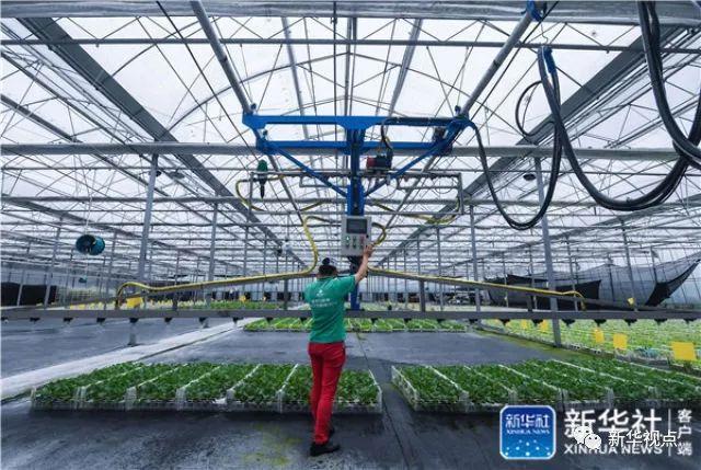 浙江省臺州市黃巖區綠沃川農場的工作人員操作噴灌系統為蔬菜噴灑營養液(6月13日攝)。綠沃川農場占地近300畝,公司立足于高科技農業種植,引進荷蘭水培蔬菜技術和空中草莓栽培技術,集合了自動化、智能化、工廠化、無土栽培和立體化種植等技術。新華社記者 徐昱 攝