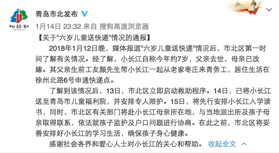 1月14日晚,青島市市北區(qū)人民政府新聞辦公室官方微博回應(yīng)“快遞男孩”一事。