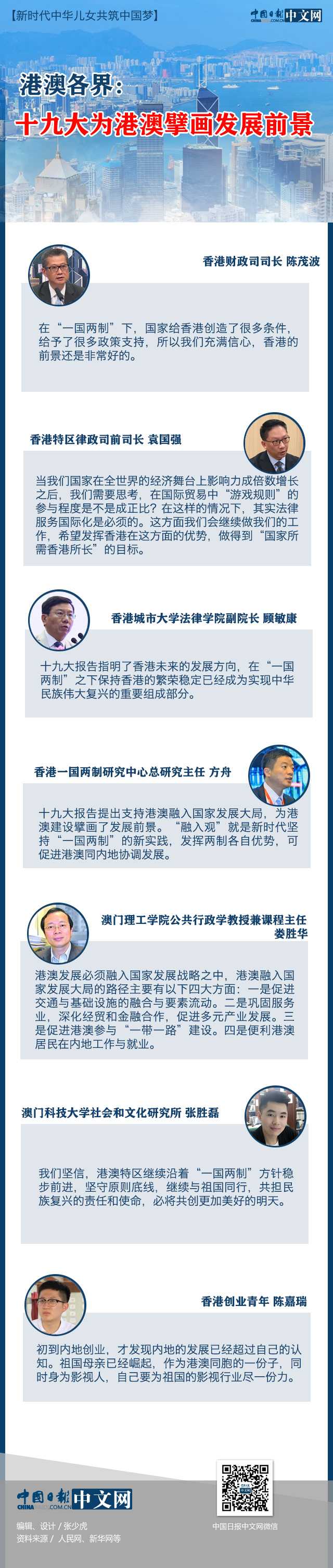 回歸祖國以來,港澳依托祖國、面向世界,“一國兩制”在港澳的實踐取得了舉世公認的成功。十九大報告明確指出,香港、澳門發(fā)展同內(nèi)地發(fā)展緊密相連,支持香港、澳門融入國家發(fā)展大局。港澳各界表示,十九大為港澳建設擘畫發(fā)展前景。
