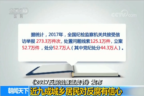 據(jù)統(tǒng)計(jì),2017年,全國(guó)紀(jì)檢監(jiān)察機(jī)關(guān)共接受信訪舉報(bào)273.3萬(wàn)件次,處置問(wèn)題線索125.1萬(wàn)件,立案52.7萬(wàn)件,處分52.7萬(wàn)人(其中黨紀(jì)處分44.3萬(wàn)人)。《2017反腐倡廉藍(lán)皮書》指出,全年立案數(shù)及處分人數(shù)超過(guò)2016年,連續(xù)五年增長(zhǎng)。群眾對(duì)反腐敗工作的滿意度上升較快。2017年,96.1%的領(lǐng)導(dǎo)干部、95.5%的普通干部、89%的專業(yè)人員、74.6%的企業(yè)管理人員和79.2%的城鄉(xiāng)居民對(duì)當(dāng)前反腐敗工作“滿意”或“比較滿意”。其中,近九成(89.20%)的城鄉(xiāng)居民對(duì)黨風(fēng)廉政建設(shè)和反腐敗斗爭(zhēng)“有信心”和“比較有信心”,比2012年提高近30個(gè)(29.2個(gè))百分點(diǎn)。