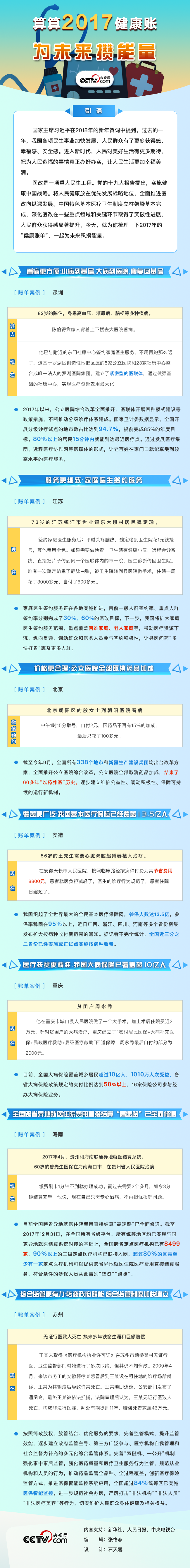醫改是一項重大民生工程。黨的十九大報告提出,實施健康中國戰略。將人民健康放在優先發展戰略地位,全面推進醫改向縱深發展。中國特色基本醫療衛生制度立柱架梁基本完成,深化醫改在一些重點領域和關鍵環節取得了突破性進展,人民群眾獲得感顯著提升。今天,就為你梳理一下2017年的“健康賬單”,一起為未來積攢能量。