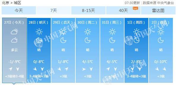 北京今天“冰凍”模式繼續,最高氣溫僅-1℃,城區以晴為主,夜間山區有零星小雪。北京市氣象臺6時發布預報,預計今天早晨氣溫-10~-8℃;白天晴轉陰,北轉南風2、3級,最高氣溫-1℃;夜間陰,山區有零星小雪轉晴,南風2級轉北風4級,最低氣溫-9℃。