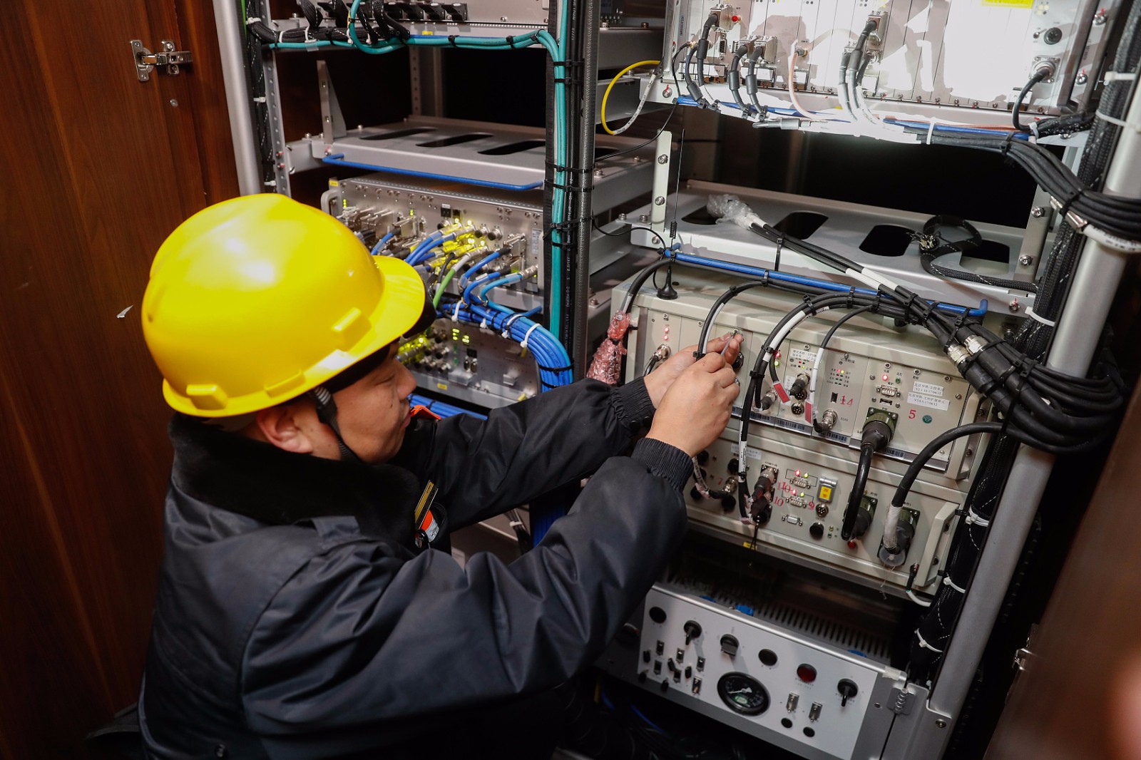 2018年2月8日晚,鐵路通信工王思益背上工具包,登上“復興號”的旋梯開始工作,他就是被譽為復興號上的“耳科醫生”——CIR庫檢人。圖片來源:視覺中國