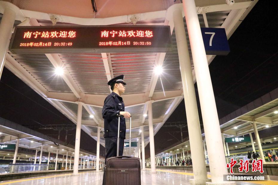 孔令揚是南寧鐵路公安處乘警支隊一名普通的乘警,今年28歲,家在山東濟南,父親曾是一名鐵路警察。平時,這名年輕的“90”后鐵警,不停地來往于南寧和濟南之間,與妻子和父母過著聚少離多的“雙城”生活,每月只有6個晚上在家。今年大年三十和初一正好是他值班,大年三十晚上20時40分,孔令揚值乘的G434次高鐵列車才到達濟南西站,孔令揚趕緊趕回家與父母團聚。2月16日(年初一)早上6時,他即從家里出發,趕到濟南西站,值乘上午8時15分由濟南西開往南寧東的G433次列車。孔令揚只能和父母相聚不到8個小時,沒來得及和妻子一起去岳母娘家省親。孔令揚只是南寧鐵路公安處大年夜值乘民警中的一員,今年大年夜和年初一,南寧鐵路公安處共有40多名民警堅守在崗位上。胡宏 攝 -