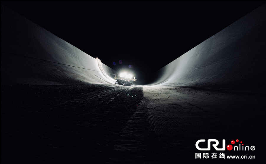 專業(yè)鏟雪車在云頂雪場的U型場地工作。 攝影:李晉