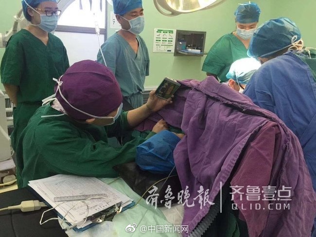 近日,在山東大學(xué)第二醫(yī)院手術(shù)室里,13歲的樂(lè)樂(lè)正在接受手術(shù),局部麻醉的他"情緒有些焦躁,一直小聲哼哼"。為不影響手術(shù)安全,護(hù)士張慧全程半蹲在旁邊,手舉手機(jī)為樂(lè)樂(lè)播放動(dòng)畫(huà)片,一個(gè)小時(shí)后,手術(shù)順利完成。圖片來(lái)源:齊魯壹點(diǎn)