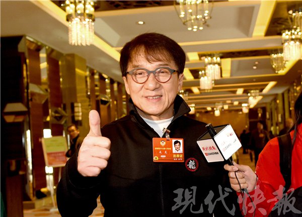 3月4日,在上午的小組會議結束后,全國政協委員成龍匆匆前往另一個會場。但當他聽到現代快報記者的提問時,立即放慢腳步自豪地說:"厲害了,我的國,主題曲是我唱的!"一邊說著,他還豎起大拇指,對著鏡頭點贊。