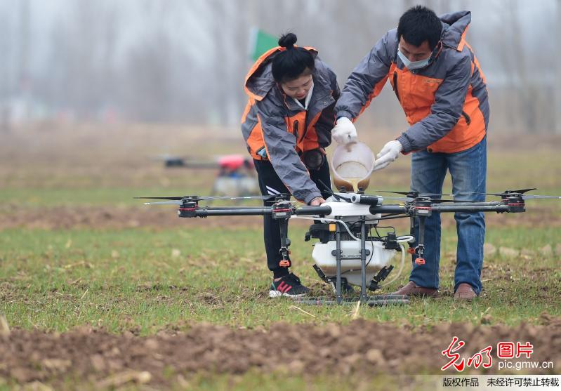 2018年3月21日,工作人員在"渤海糧倉"河北滄州項目區操作無人機對冬小麥進行農藥與營養噴灑作業。
