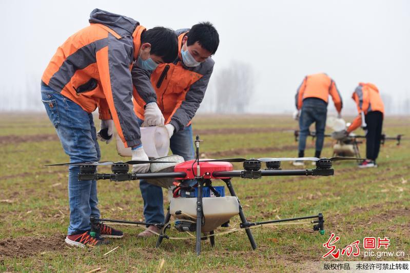 隨著氣溫回升,北方地區農業生產進入春季繁忙時節。國家糧食增產工程"渤海糧倉"河北滄州項目區泊頭市付村的冬小麥進入病蟲害防治、灌溉追肥管理階段,當地啟用大量無人機進行大范圍噴灑農藥、營養液作業,大幅度提高了作業效率與噴灑的精準度。(傅新春攝/光明圖片)