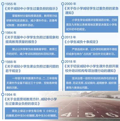 為什么會這樣?其實,自1955年7月教育部發出新中國第一個“減負令”——《關于減輕中小學生過重負擔的指示》以來,60余年間我國中央及地方相關部門出臺的學生“減負令”多達上百道,圍繞學習時間、考核方式、教材內容、課外活動、教師水平、學校領導等方面做出了一系列細致嚴謹的規定。