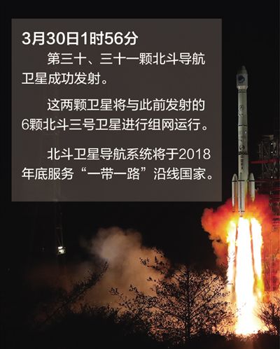 3月30日1時56分,我國在西昌衛星發射中心用長征三號乙運載火箭(及遠征一號上面級),以“一箭雙星”方式成功發射第三十、三十一顆北斗導航衛星。