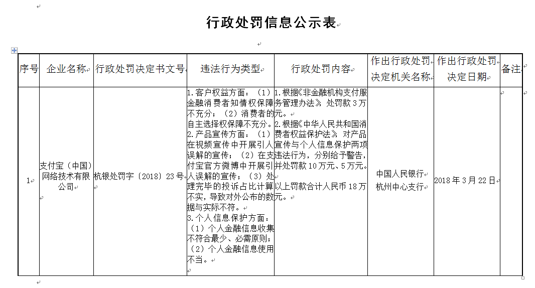 人民網(wǎng)北京4月9日電 據(jù)中國人民銀行網(wǎng)站杭州中心支行消息,昨日,中國人民銀行杭州中心支行根據(jù)《非金融機構支付服務管理辦法》,對支付寶(中國)網(wǎng)絡技術有限公司處罰款3萬元;根據(jù)《中華人民共和國消費者權益保護法》,對支付寶(中國)網(wǎng)絡技術有限公司產品宣傳與個人信息保護兩項違法行為,分別給予警告,并處罰款10萬元、5萬元。罰款合計18萬元。