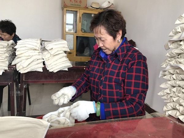 在青海省海西蒙古族藏族自治州烏蘭縣銅普鎮都蘭河村,村民在包裝鹽敷袋,一天可以掙上百元(5月15日攝)。