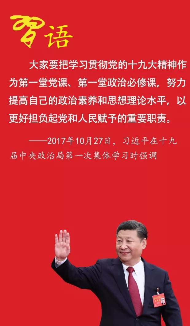大家要把學(xué)習(xí)貫徹黨的十九大精神作為第一堂黨課、第一堂政治必修課,努力提高自己的政治素養(yǎng)和思想理論水平,以更好擔(dān)負(fù)起黨和人民賦予的重要職責(zé)。