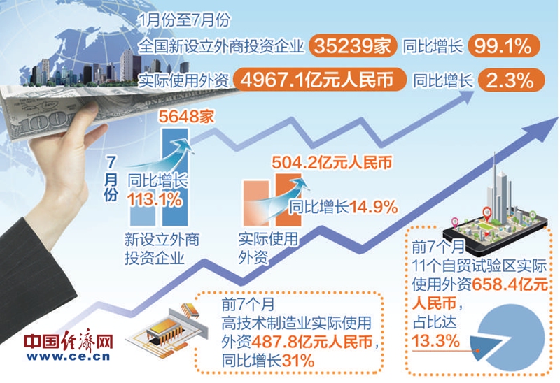 8月16日,商務部發(fā)布最新吸收外資數(shù)據(jù)顯示,1月至7月,全國新設立外商投資企業(yè)35239家,同比增長99.1%;實際使用外資4967.1億元人民幣,同比增長2.3%。7月當月,全國新設立外商投資企業(yè)5648家,同比增長113.1%;實際使用外資504.2億元人民幣,同比增長14.9%。商務部外資司副司長朱冰表示,從前7個月整體情況看,新設企業(yè)勢頭良好,實際使用外資穩(wěn)定增長。