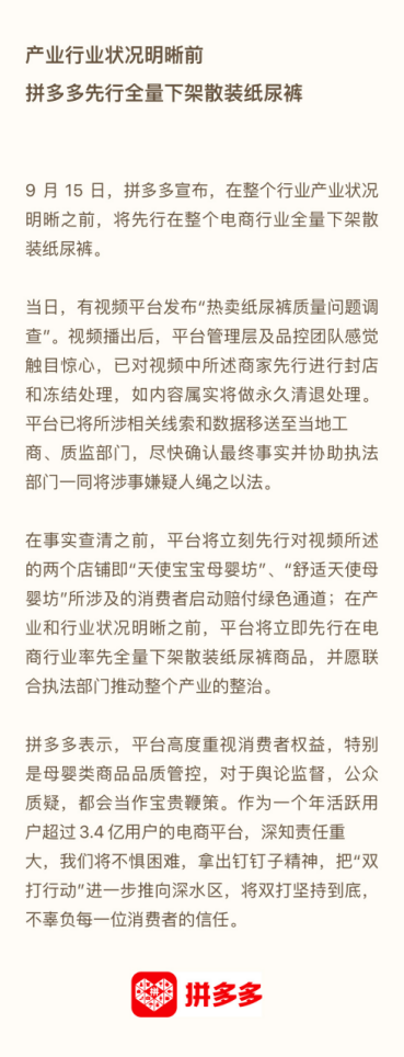 就此,拼多多發表聲明表示,視頻播出后,平臺管理層及品控團隊感覺觸目驚心,已對視頻中所述商家先行進行封店和凍結處理,如內容屬實將做永久清退處理。平臺已將所涉相關線索和數據移送至當地工商、質監部門,盡快確認最終事實并協助執法部門一同將涉事嫌疑人繩之以法。在事實查清之前,拼多多平臺將立刻先行對視頻所述的兩個店鋪即“天使寶寶母嬰坊”、“舒適天使母嬰坊”所涉及的消費者啟動賠付綠色通道;在產業和行業狀況明晰之前,平臺將立即先行在電商行業率先全量下架散裝紙尿褲商品,并愿聯合執法部門推動整個產業的整治。