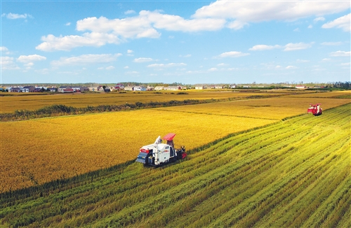 10月18日,在江蘇省鹽城市大豐區新豐鎮老墩村,收割機在稻田里收獲水稻(無人機拍攝)。 (新華社發)