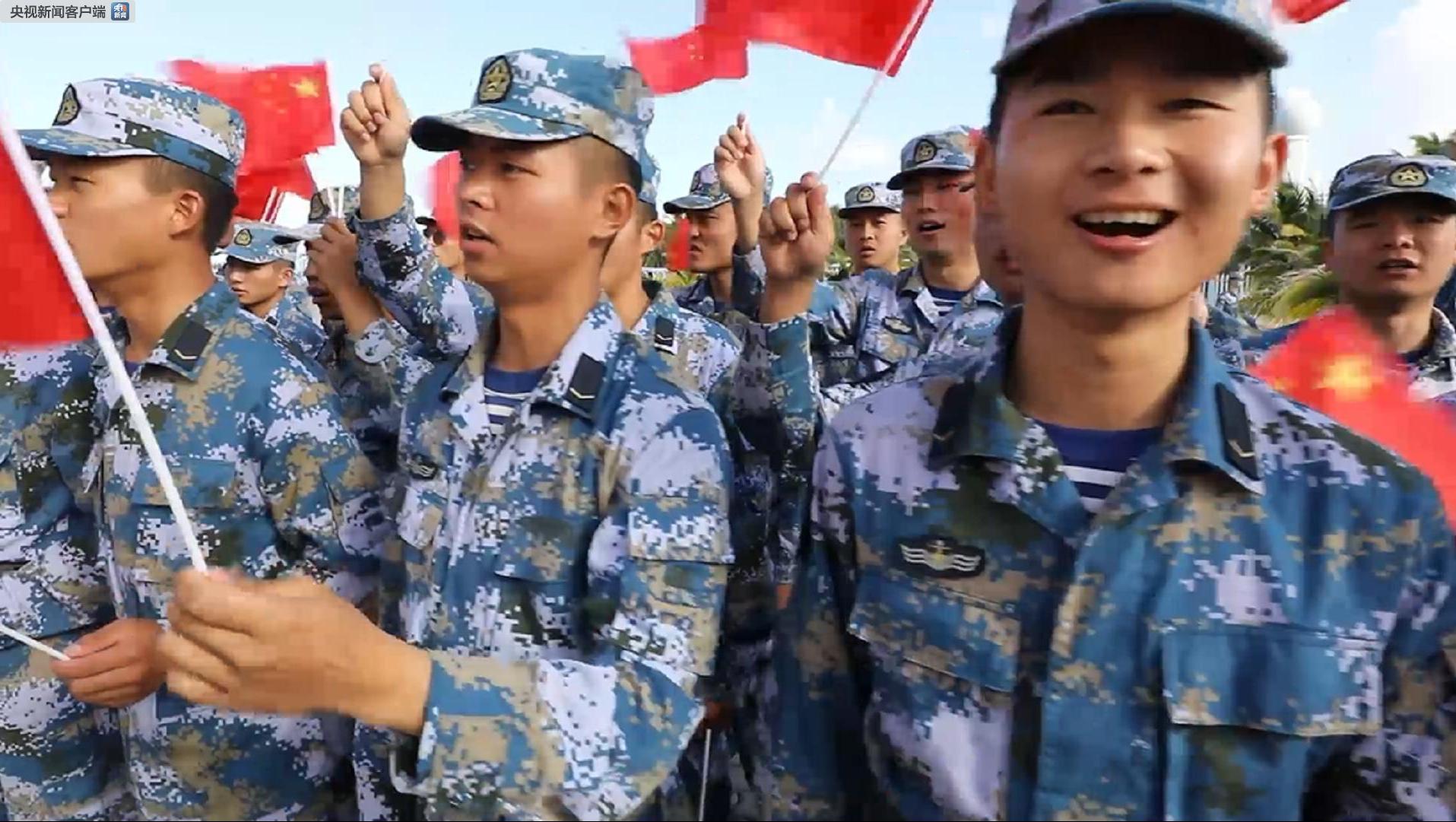 △三沙市工作人員、漁民和駐市部隊官兵揮舞著國旗,加入合唱