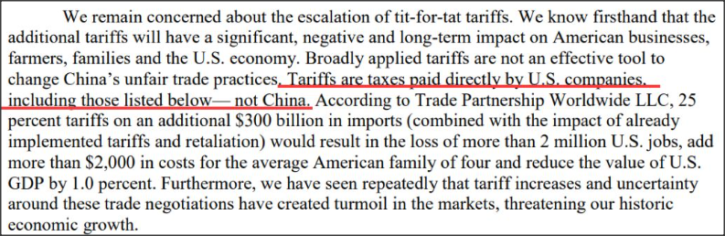 “這些關稅是直接由美國企業支付的稅金,而不是中國”,這些企業在信中寫道,“我們深知這些關稅將會給美國的企業、農民、家庭以及美國經濟帶來重大的、負面的長久的沖擊”。