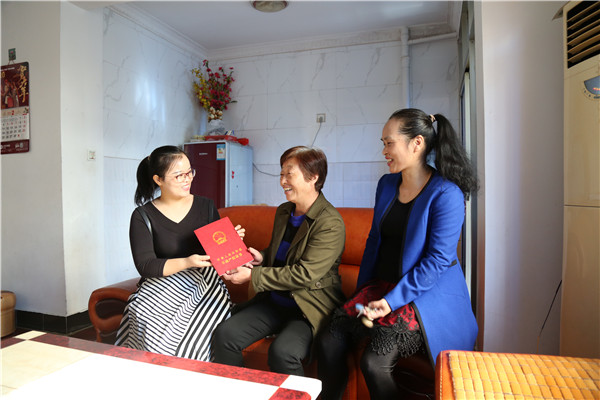 圖為龍巖市發(fā)改委干部為新羅區(qū)梅林新村福樂(lè)花園小區(qū)居民送上不動(dòng)產(chǎn)權(quán)證