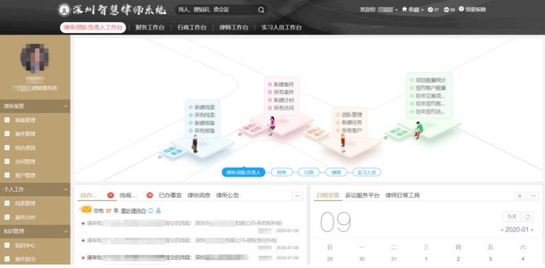 深圳智慧律師系統(tǒng)以多入口匯集PC工作臺、移動工作臺、報(bào)表中心、角色門戶等多平臺,在對接外部系統(tǒng)時采用了異構(gòu)系統(tǒng)集成和自由系統(tǒng)鏈接的方式,區(qū)分不同登錄主體身份配置不同的工作臺,所適用界面與功能也因登錄主體身份不同可獲精確應(yīng)用。例如,以律師身份登錄所展示的有五大功能模塊:律所案管、個人工作、知識管理、會員服務(wù)、訴訟服務(wù),主體界面重點(diǎn)突出律師的案件管理和與律所管理的協(xié)同。