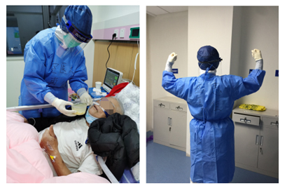每天提前一個半小時坐通勤車前往我們戰斗的地方,搖搖晃晃到達醫院樓下,自覺排隊出示工作證,量體溫進入病區,換下作戰靴,穿著輕便的護士鞋進入科室第一道大門。洗手、換洗手衣、洗手、戴N95口罩、帽子、護眼鏡、手套、防護服、靴套、洗手、隔離衣、帽子、口罩、面屏、手套、靴套等待檢查,穿戴完畢,經過6道門進入紅區開始一整天的生活。