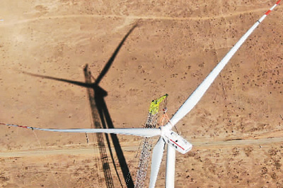 圖為5月1日,在青海省海南州共和縣的國家電投黃河公司風力發電項目建設現場,風力發電機組在吊裝。