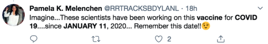 網民Pamela K.Melenchen稱,“想想看,這些科學家從1月11日就開始進行疫苗研發了,請記住這個日期!”↓↓↓