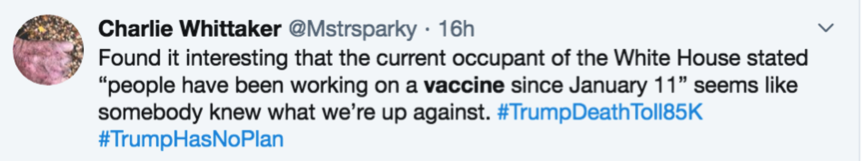科學家查理·惠特克(Charlie Whittaker)稱:“總統說人們自從1月11日就開始研發疫苗,這真的很有趣,似乎有人早就知道我們面對的是什么。”↓↓↓