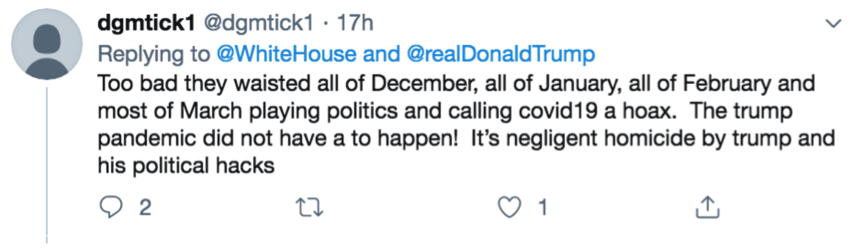 網民dgmtick1表示 :“糟糕的是,政客們浪費了整個12月、1月、2月以及3月份大多數時間來玩他們的政治游戲,還居然稱新冠病毒是場騙局。這是特朗普和他的政客們的過失殺人行為。”↓↓↓