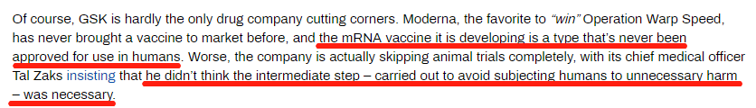 文章稱,美國政府啟動(dòng)所謂的“曲速行動(dòng)”,推動(dòng)衛(wèi)生與公眾服務(wù)部、國防部等多部門加速研發(fā)新冠疫苗。美國總統(tǒng)特朗普還稱,爭取今年年底前實(shí)現(xiàn)疫苗的量產(chǎn)和分發(fā)。在這樣的情況下,一些美國醫(yī)藥公司為了“趕進(jìn)度”跳過關(guān)鍵環(huán)節(jié)。