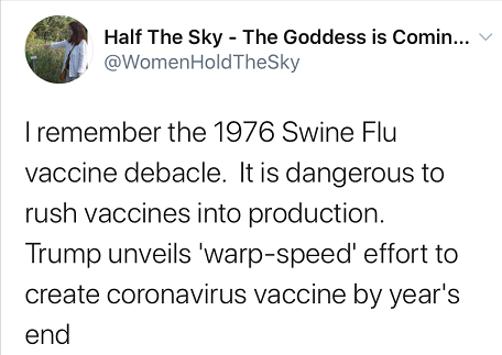 △網(wǎng)友評論:我記得1976年的豬流感疫苗大敗,急于生產(chǎn)疫苗是很危險(xiǎn)的。
