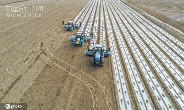 2020年4月1日,無人駕駛GPS衛星導航播種機在塔里木鄉播種棉花。