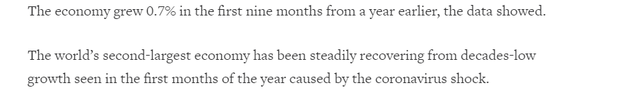 路透社報(bào)道,中國(guó)前三季度GDP同比增長(zhǎng)0.7%,世界第二大經(jīng)濟(jì)體正穩(wěn)步從年初受疫情影響的經(jīng)濟(jì)增長(zhǎng)放緩中恢復(fù)過(guò)來(lái)。中國(guó)實(shí)施了一系列措施,包括積極的財(cái)政政策、減稅政策以及降低貸款利率和銀行準(zhǔn)備金等,促進(jìn)恢復(fù)經(jīng)濟(jì)、提升就業(yè)。