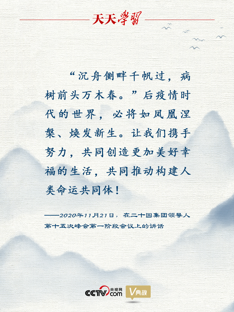 天天學(xué)習(xí)當(dāng)前,新冠肺炎疫情仍在全球肆虐。國(guó)際社會(huì)都很關(guān)心后疫情時(shí)代的國(guó)際秩序和全球治理,也很關(guān)注二十國(guó)集團(tuán)將發(fā)揮什么樣的作用。11月21日晚,在二十國(guó)集團(tuán)領(lǐng)導(dǎo)人第十五次峰會(huì)第一階段會(huì)議上,習(xí)近平主席在北京以視頻方式發(fā)表題為《勠力戰(zhàn)疫 共創(chuàng)未來》的講話,為后疫情時(shí)代的國(guó)際秩序和全球治理貢獻(xiàn)了中國(guó)方案,為推動(dòng)構(gòu)建人類命運(yùn)共同體注入了中國(guó)力量。