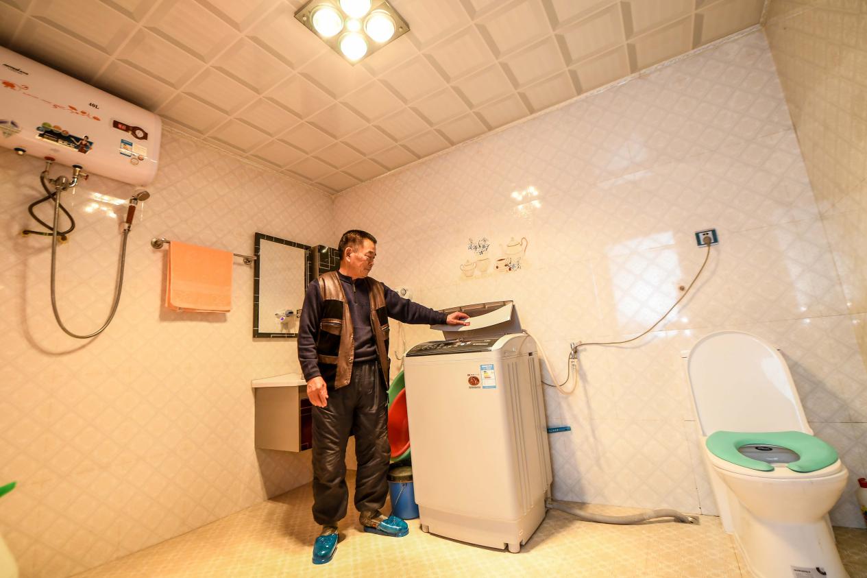 2017年1月24日,吉林延邊光東村村民全得成在自家衛生間內使用洗衣機。