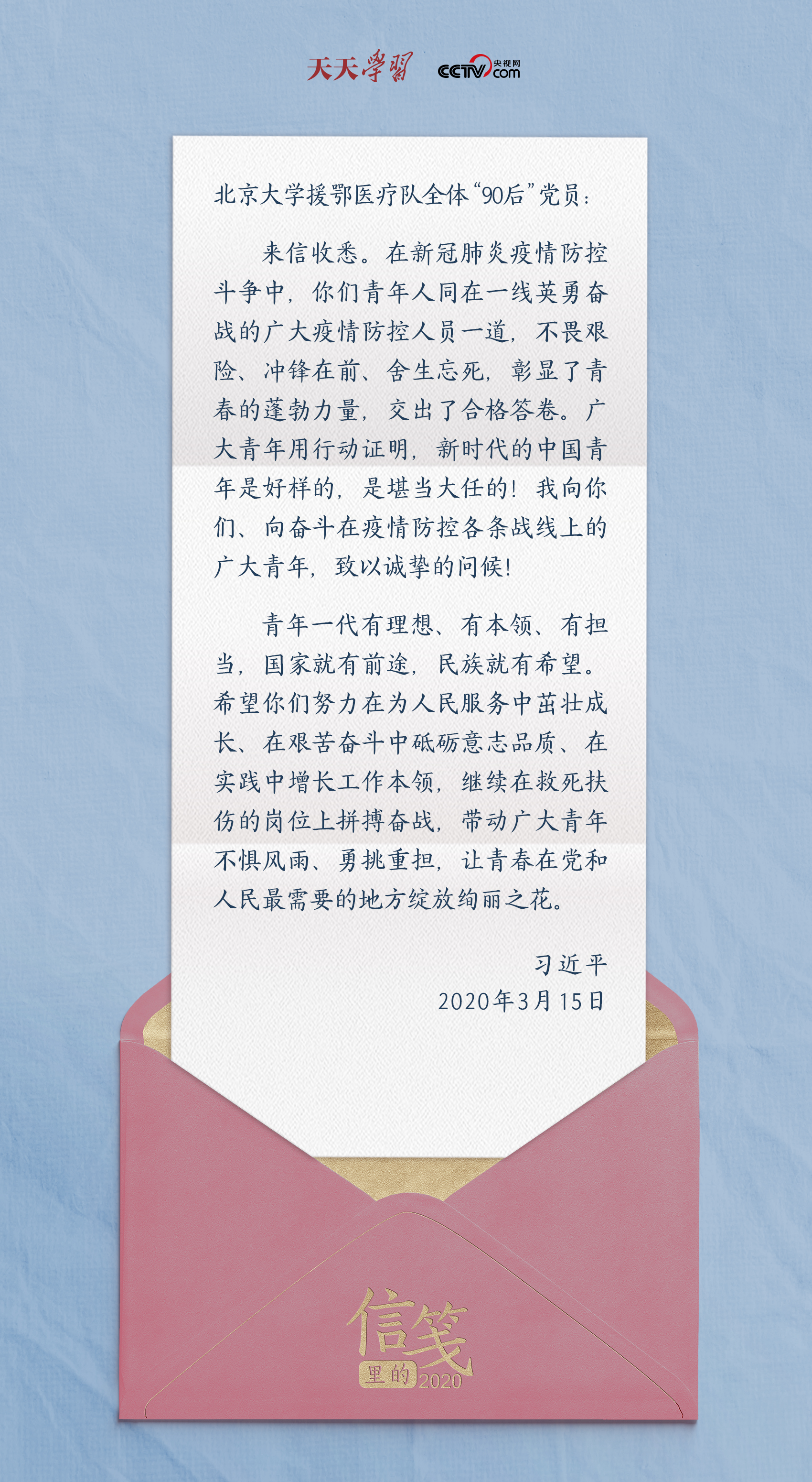 2020年3月15日,北京大學援鄂醫療隊全體“90后”黨員收到了總書記的回信。回信中,總書記勉勵他們讓青春在黨和人民最需要的地方綻放絢麗之花。