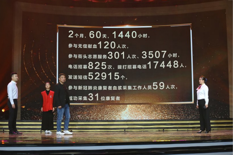 舞臺(tái)的屏幕上顯示一組數(shù)字:2個(gè)月,60天,1440小時(shí),參與無(wú)償獻(xiàn)血120人次,參與街頭志愿服務(wù)301人次、3507小時(shí),電話招募825次,撥打招募電話17448人,發(fā)送短信52915個(gè),采集康復(fù)者血漿9批次,血漿15600毫升。