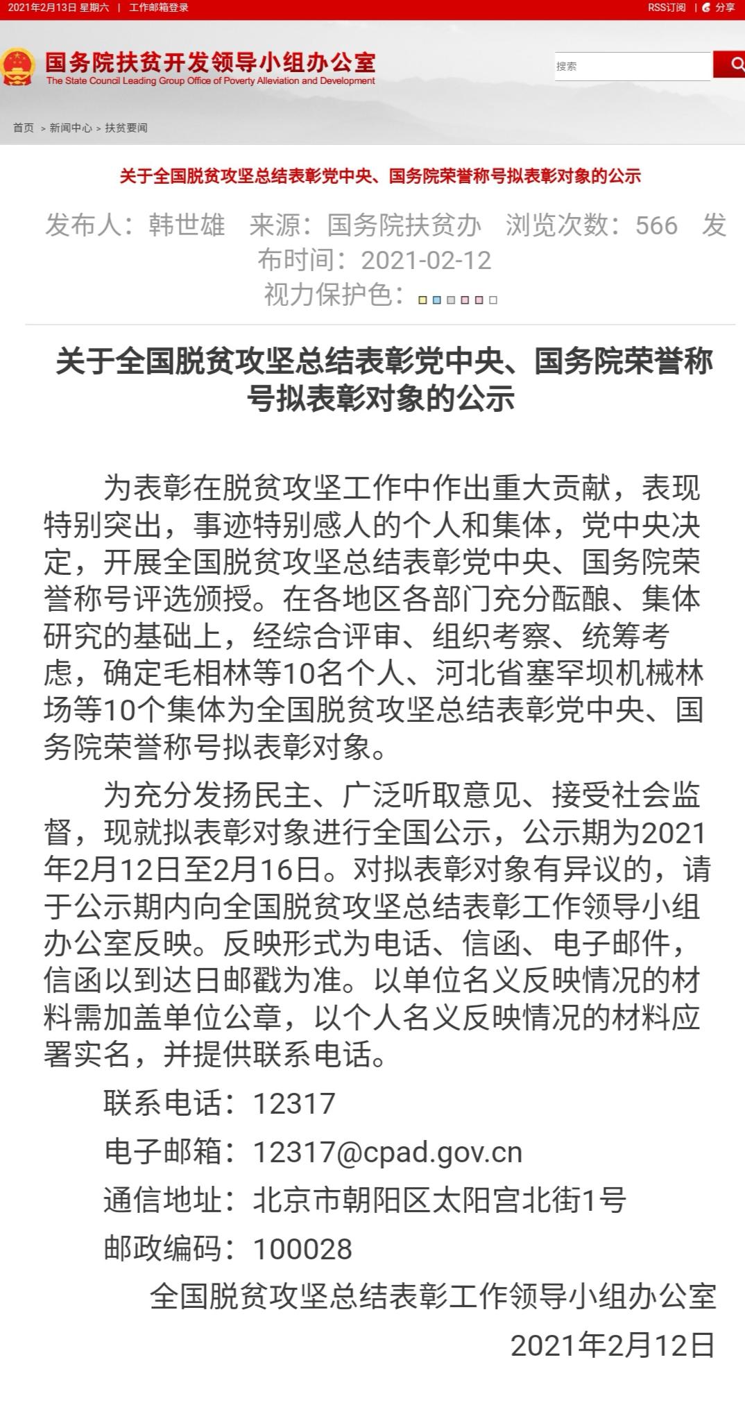 2月12日,全國脫貧攻堅總結表彰工作領導小組辦公室發布《關于全國脫貧攻堅總結表彰黨中央、國務院榮譽稱號擬表彰對象的公示》,10名個人、10個集體為擬表彰對象。