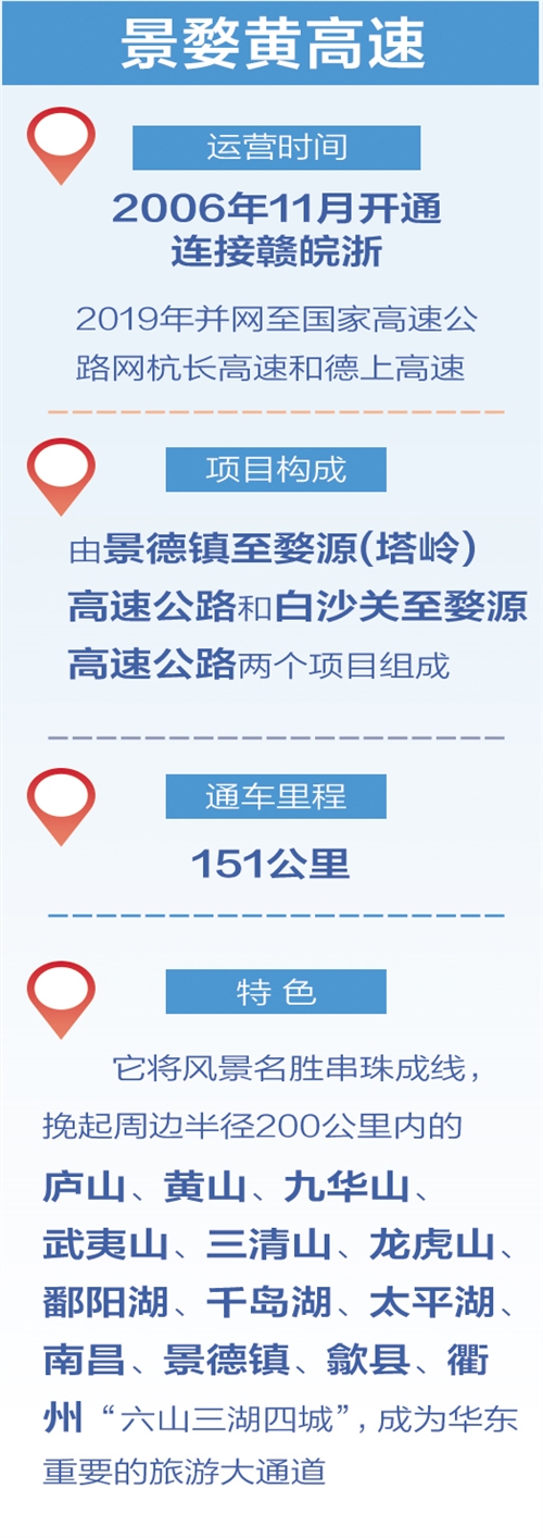“滬、杭、黃(山)、婺源、景德鎮、九(江)是我國最具開發潛力的旅游經濟干線之一,景婺黃高速公路的開通,大大縮短了相互間的時空距離,形成贛皖浙滬旅游風光帶。”江西省交通投資集團景德鎮管理中心黨委副書記章勇說。