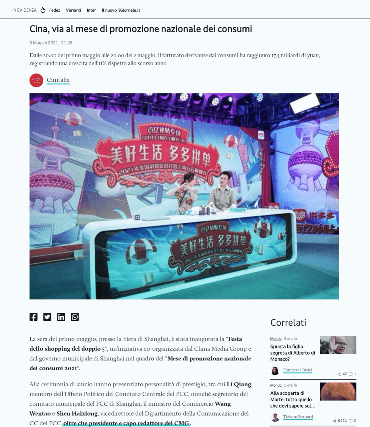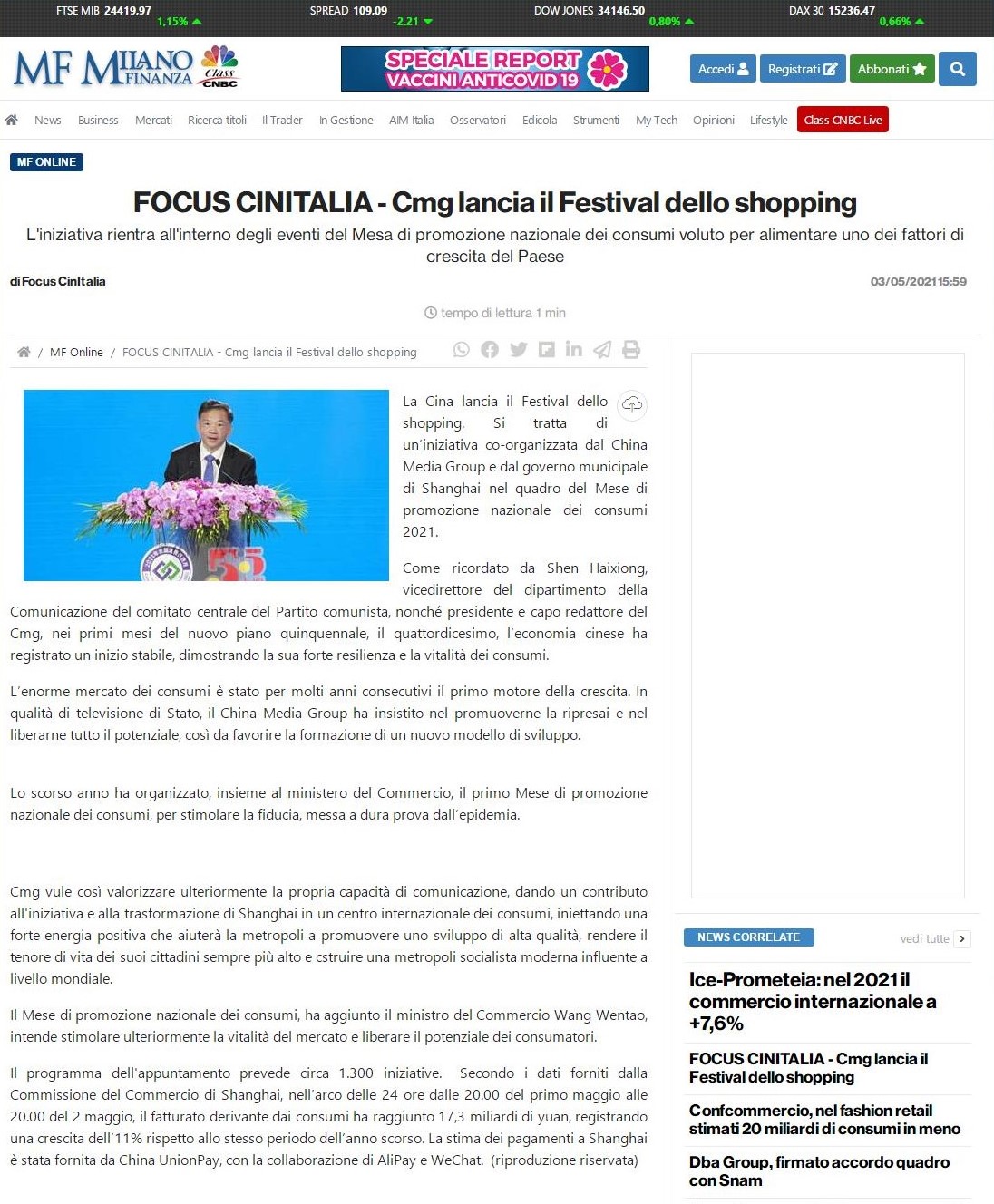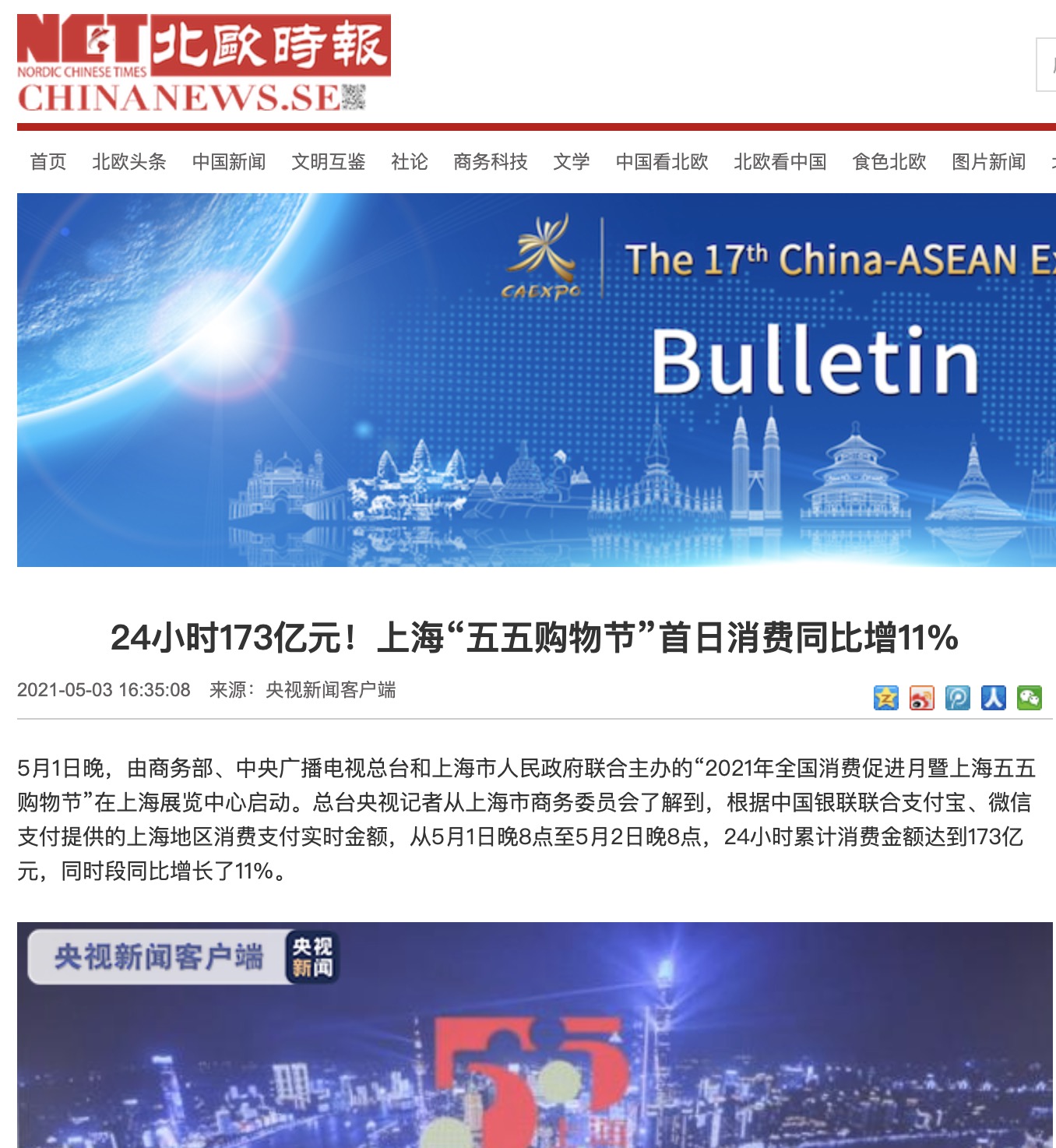 活動(dòng)引發(fā)海外媒體廣泛關(guān)注。截至5月4日,美國全國廣播公司CNBC財(cái)經(jīng)頻道、《歐洲時(shí)報(bào)》德文網(wǎng)、《北歐時(shí)報(bào)》網(wǎng)站、意大利《米蘭財(cái)經(jīng)報(bào)》網(wǎng)站、意大利《日?qǐng)?bào)》網(wǎng)站、挪威國家廣播電視一臺(tái)(NRK 1)、日本最大的中國資訊門戶網(wǎng)站Record China、印度《每日力量報(bào)》網(wǎng)站、土耳其經(jīng)濟(jì)觀察網(wǎng)、《哈薩克斯坦實(shí)業(yè)報(bào)》網(wǎng)站、保加利亞新聞門戶網(wǎng)站“24小時(shí)”、埃及《今日消息報(bào)》、尼日利亞《領(lǐng)導(dǎo)者報(bào)》網(wǎng)站、尼羅河國際電視臺(tái)(Nile TV International)、越南國家電視臺(tái)綜合頻道(VTV1)、印尼艾爾辛達(dá)新聞網(wǎng)、柬埔寨Freshnews網(wǎng)站以及香港大公報(bào)、文匯報(bào)紛紛轉(zhuǎn)載轉(zhuǎn)引。多家媒體表示,中國經(jīng)濟(jì)在“十四五”規(guī)劃的第一個(gè)春天迎來穩(wěn)健開局,消費(fèi)市場(chǎng)規(guī)模持續(xù)擴(kuò)大成為發(fā)展動(dòng)力。