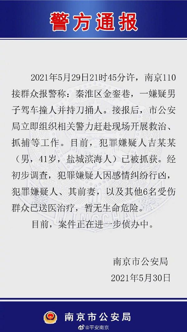 據南京市公安局官方微博消息,2021年5月29日21時45分許,南京110接群眾報警稱:秦淮區金鑾巷,一嫌疑男子駕車撞人并持刀捅人。接報后,南京市公安局立即組織相關警力趕赴現場開展救治、抓捕等工作。目前,犯罪嫌疑人吉某某(男,41歲,鹽城濱海人)已被抓獲。經初步調查,犯罪嫌疑人因感情糾紛行兇,犯罪嫌疑人、其前妻,以及其他6名受傷群眾已送醫治療,暫無生命危險。