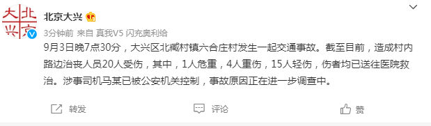 據“北京大興”微博消息,9月3日晚7點30分,大興區北臧村鎮六合莊村發生一起交通事故。截至目前,造成村內路邊治喪人員20人受傷,其中,1人危重,4人重傷,15人輕傷,傷者均已送往醫院救治。涉事司機馬某已被公安機關控制,事故原因正在進一步調查中。