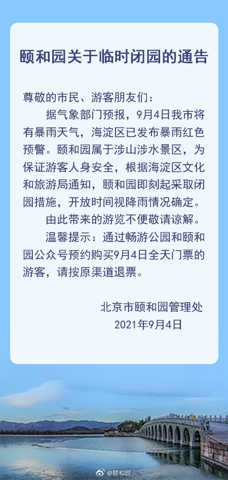 根據北京市氣象部門預報,今日(4日)北京市將有暴雨天氣。頤和園、香山公園和北京植物園屬于涉山涉水景區,為了保證游客人身安全,即刻起臨時關閉,開放時間將視雨晴而定。