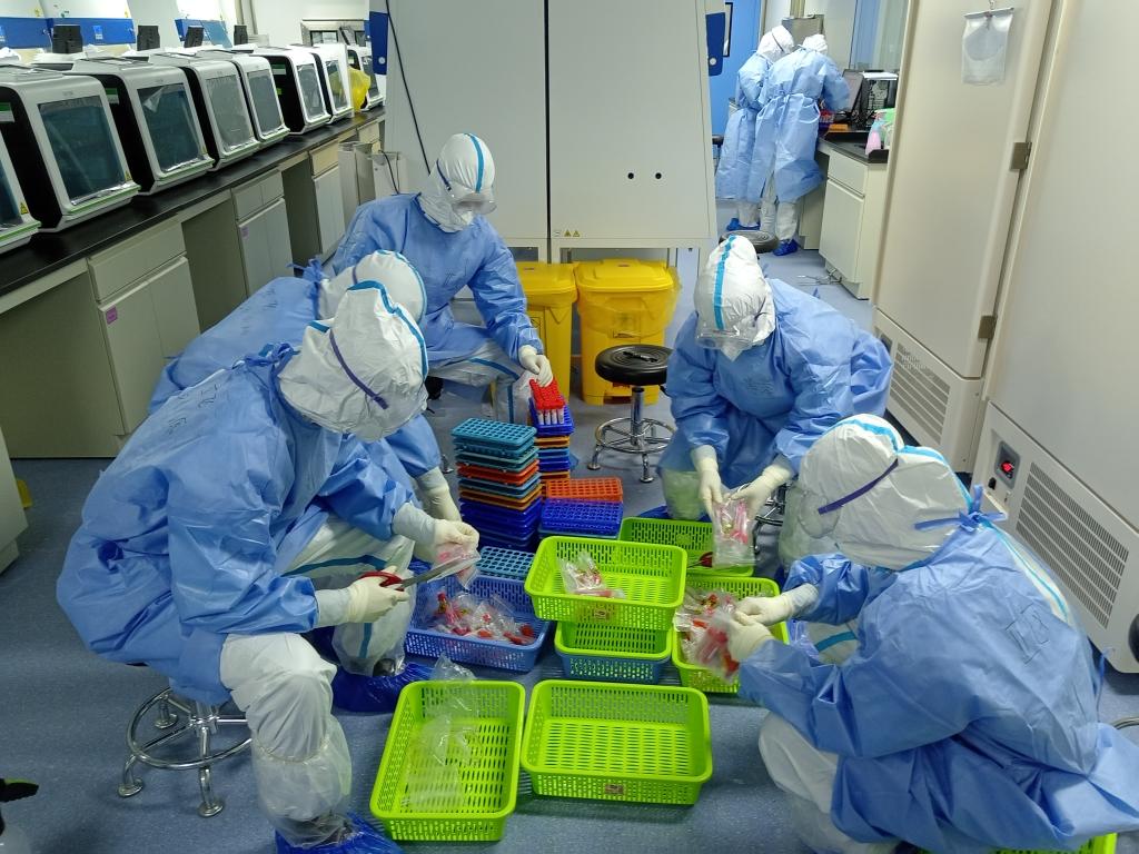 西寧市城中區核酸檢測聯盟實驗室的工作人員在相互加油打氣。(受訪者供圖)