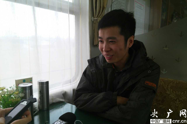 河南商丘的旅客賈帥在連線前和記者溝通(記者劉會民 攝)