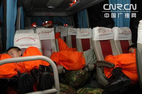 晚20時50分,為了爭取救援時間,救援隊官兵分乘10輛客車星夜兼程趕赴地震災區。晚上22時30分,救援隊在德陽服務區停留15分鐘,官兵們在路邊以餅干、礦泉水簡單充饑后,向重災區平武縣南壩鎮挺進。南壩鎮是目前綿陽災區4個交通完全中斷的“孤島鎮”之一,至平武縣城和江油市的道路均因橋梁垮塌和滑體而中斷,災情十分嚴重。